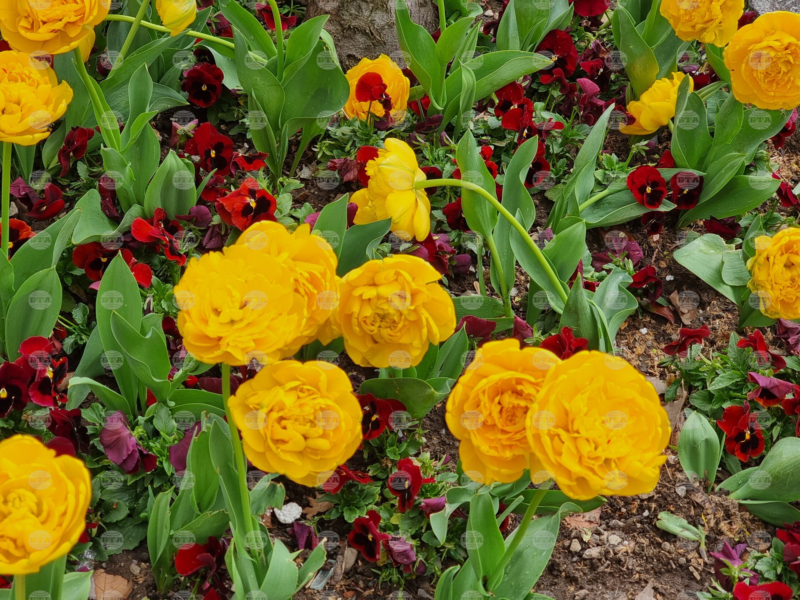 Кичести холандски лалета и виоли оформят цветните композиции в Сливен