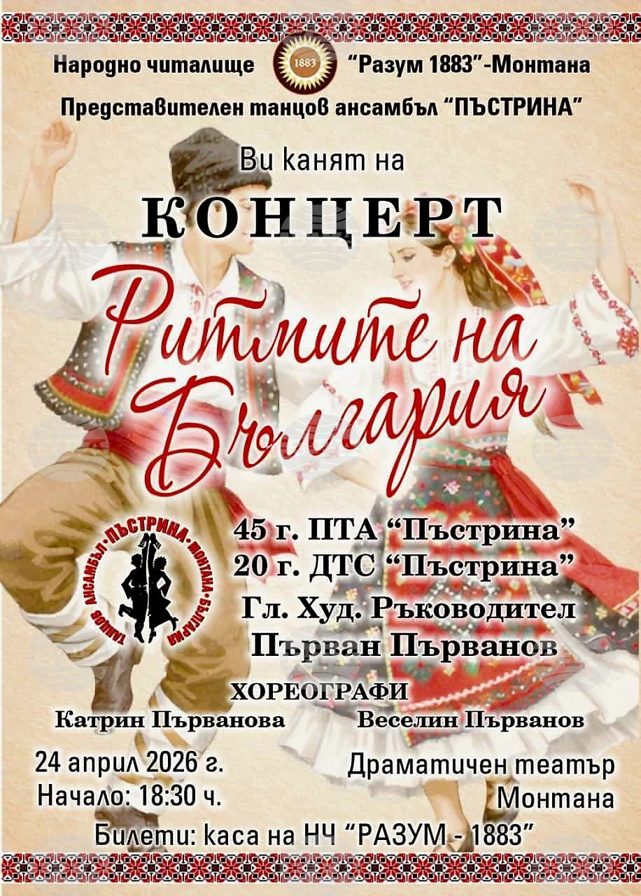 Представителен танцов ансамбъл „Пъстрина“ ще отбележи своята 45-годишнина с концерта „Ритмите на България“ на 24 април в Драматичен театър „Драгомир Асенов“ в Монтана, съобщиха от общинската управа. Със събитието ще…